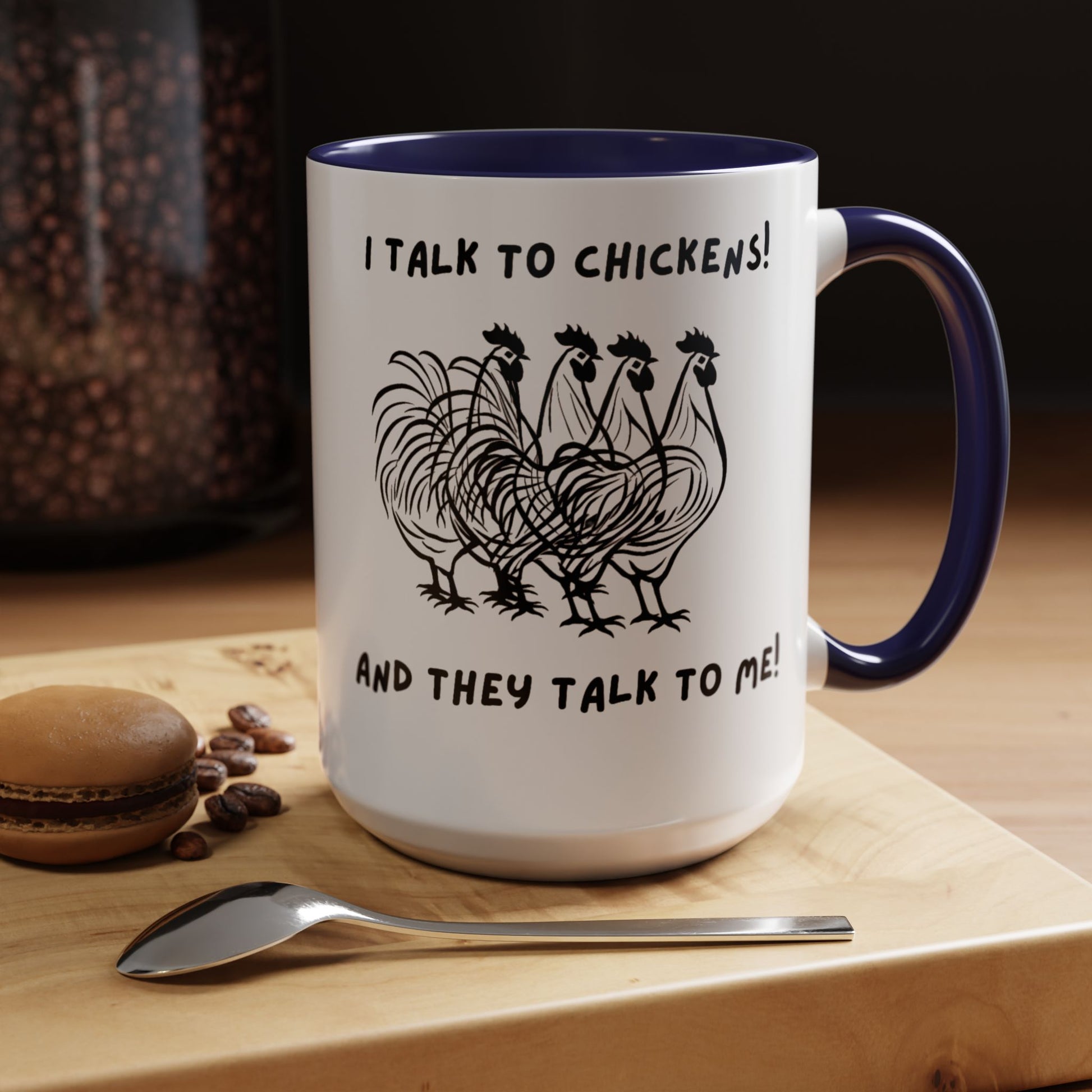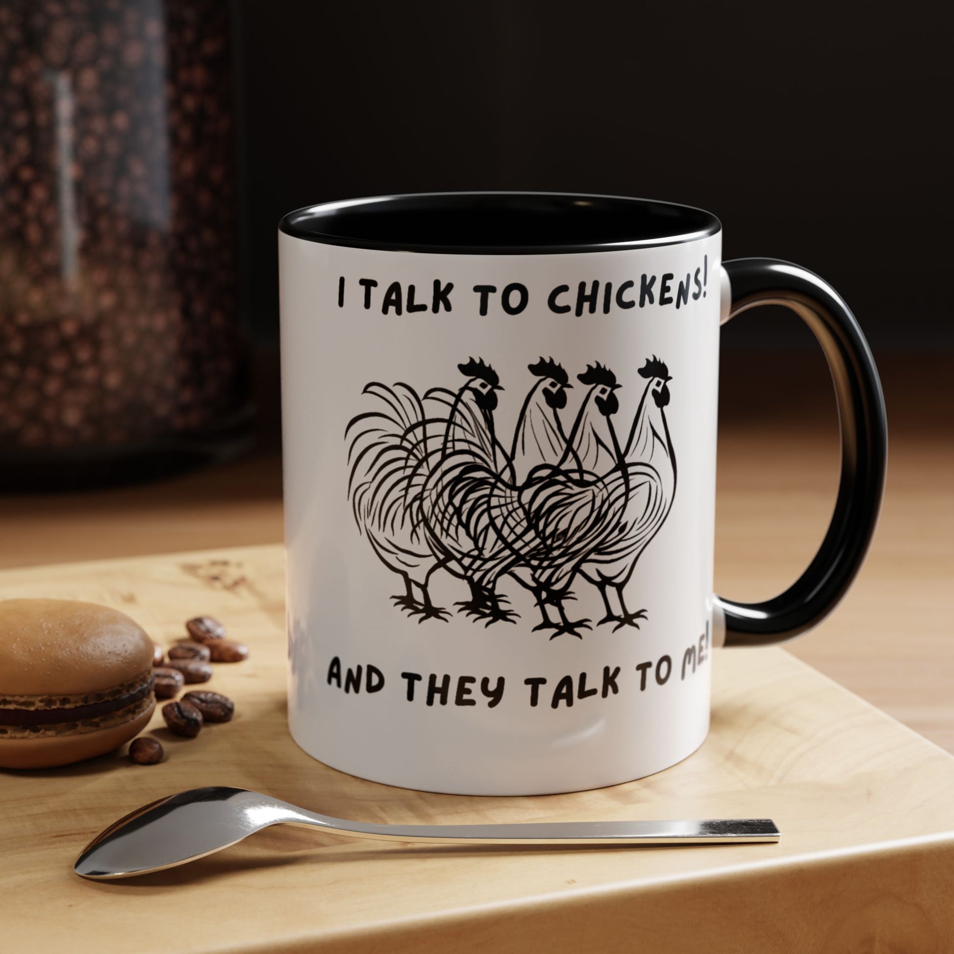 If you talk to chickens, they will talk to you! This funny mug is great for your coffee, tea, or hot chocolate! Available in two generous sizes, 11oz and 15oz, and five colors to chose from, you can find those that fit your style. The ergonomic C-shaped handle provides a comfortable grip, lead and BPA-free construction guarantee peace of mind with every sip.