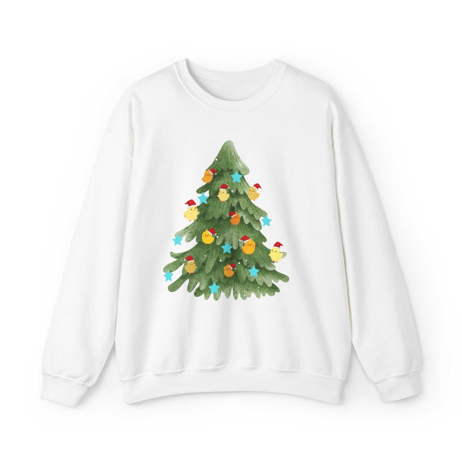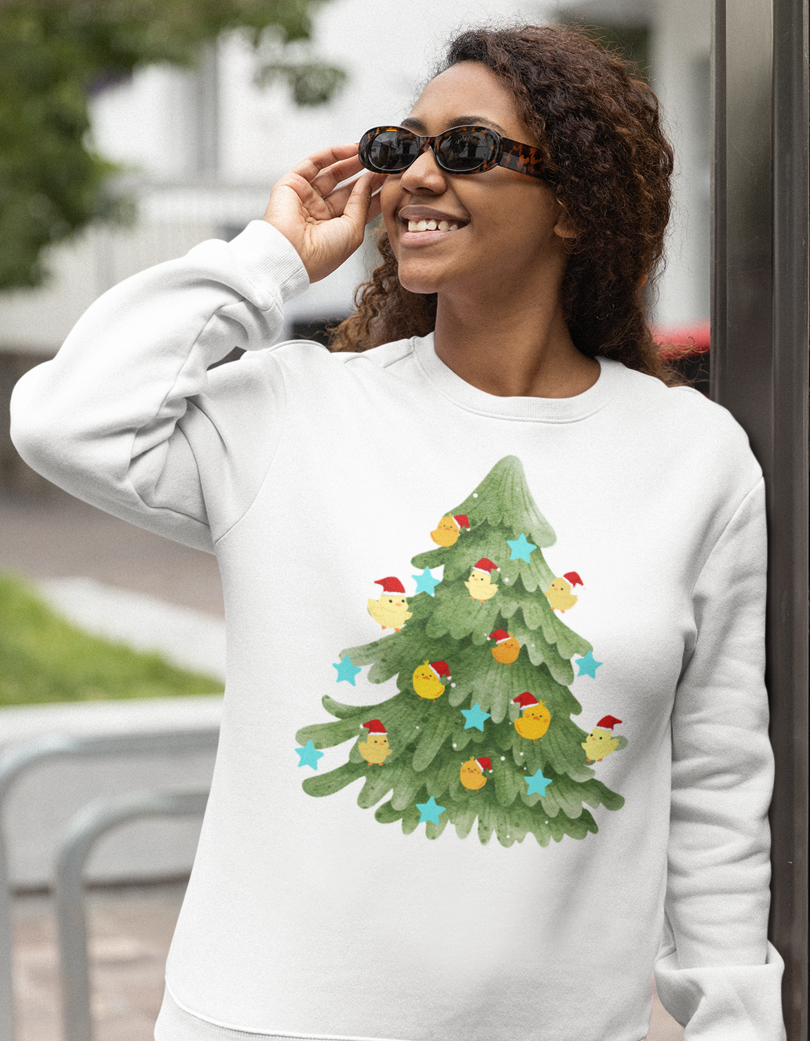 These little Christmas chickies are decorated up in this Chickmas tree! This cozy sweatshirt is perfect for winter weather! Blend of polyester and cotton, design stay crisp and eye-catching, wash after wash.