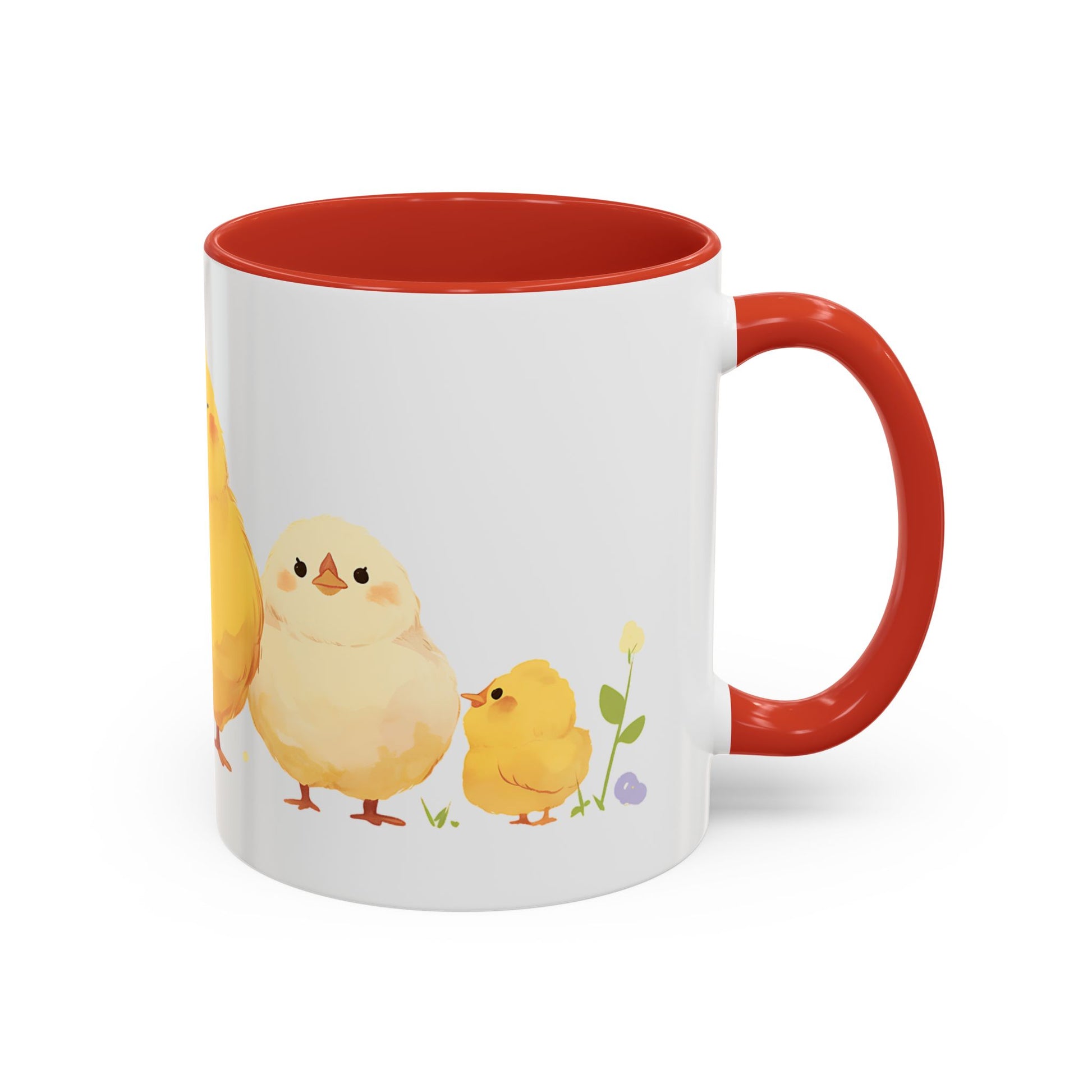 Humorous chicken family greets your day. This mug is perfect for your mornings, afternoon, or evening tea, coffee, or hot chocolate! Available in a generous 15 oz size, and choice of four interior colors: black, red, pink and teal.
